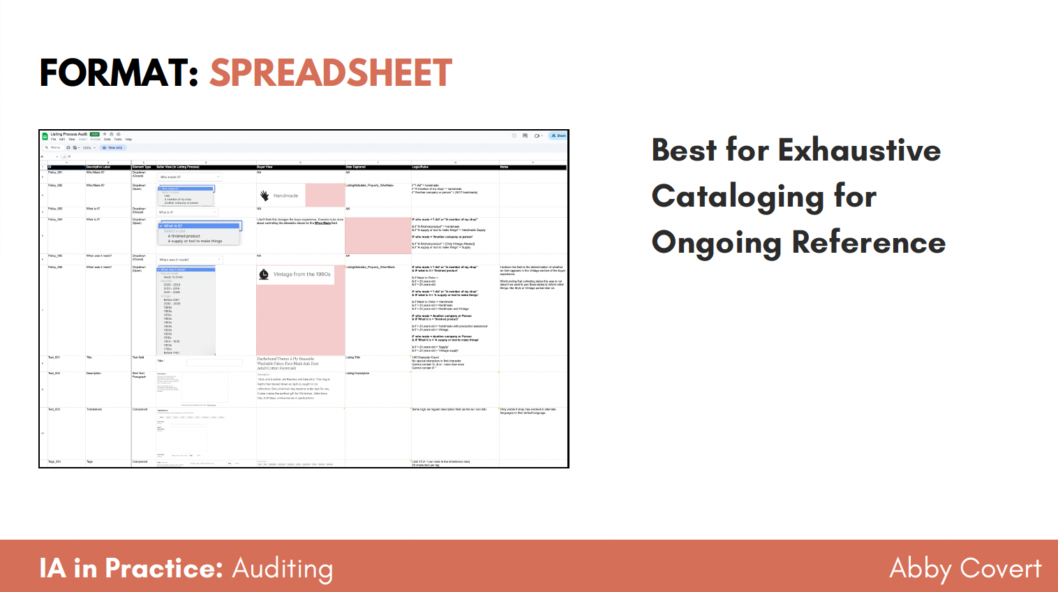 Walks through four audit output formats with real examples: spreadsheet for exhaustive cataloging, white paper for capturing nuance, diagram for clearing up mental model issues, and in-tool views for governance and quick action.
