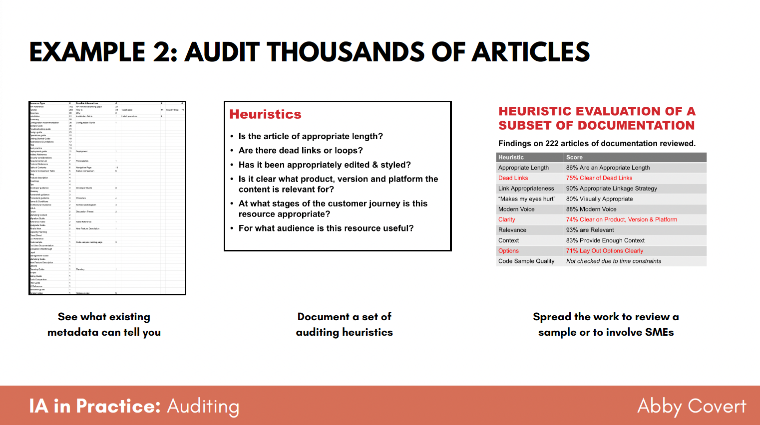 - Real-world examples covered in depth: a navigation redesign audit and a large-scale article quality audit